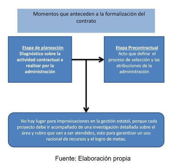 En este sentido, hay dos momentos importantes que anteceden la formalización del acuerdo de voluntades, en primer orden se encuentra la etapa de planeación entendida como un estudio de campo sobre la actividad contractual que se va a realizar. En esta etapa se encarga a los servidores públicos, que los negocios a celebrar sean correctamente diseñados conforme a las necesidades de la colectividad y al marco jurídico aplicable. Por lo cual, resulta apremiante que el estudio contemple el uso racional de los recursos asignados a las administraciones públicas tomando en cuenta los planes de desarrollo y gastos que hay que cubrir, para luego elegir la modalidad contractual más adecuada a los fines propuestos.[2] No existe espacio para la improvisación en la gestión estatal, todo proyecto debe sustentarse en una investigación pormenorizada sobre el rubro que va a hacer atendido para alcanzar las metas propuestas.
