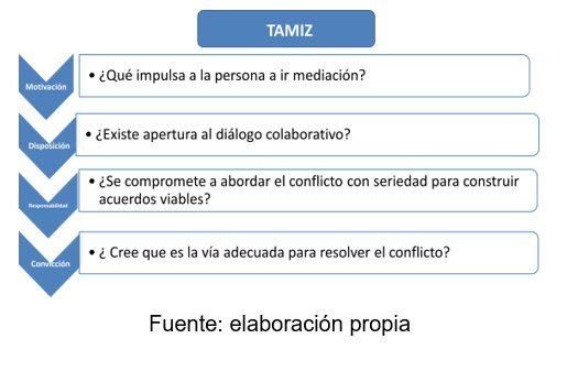 En este sentido hay que mencionar que la etapa de premediación es fundamental para la culminación satisfactoria del proceso de mediación. Tal aseveración responde a que es el momento de diagnóstico y evaluación preliminar para conocer a fondo la naturaleza y dinámica del conflicto que se presenta, así como las características y situaciones personales de quienes comparecen como intervinientes. Considerando estos aspectos, hemos desarrollado un instrumento nombrado ¨tamiz mediador¨ que orienta la etapa introductoria mediante cuatro ejes o filtros que permiten garantizar la idoneidad del conflicto, a través de la delimitación de los casos aptos para mediación, así como evaluar la capacidad, interés y equilibro entre los intervinientes.