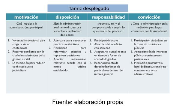 Al desplegar un tamiz con estos recursos y rubros, se podría identificar cuál es la voluntad tanto institucional como individual para optar por una vía no contenciosa. Además, comprobar si existe la disposición para ser flexible y asumir un papel activo, pues el objetivo final es verificar si existe la apertura necesaria para armonizar los intereses particulares con los de la colectividad.